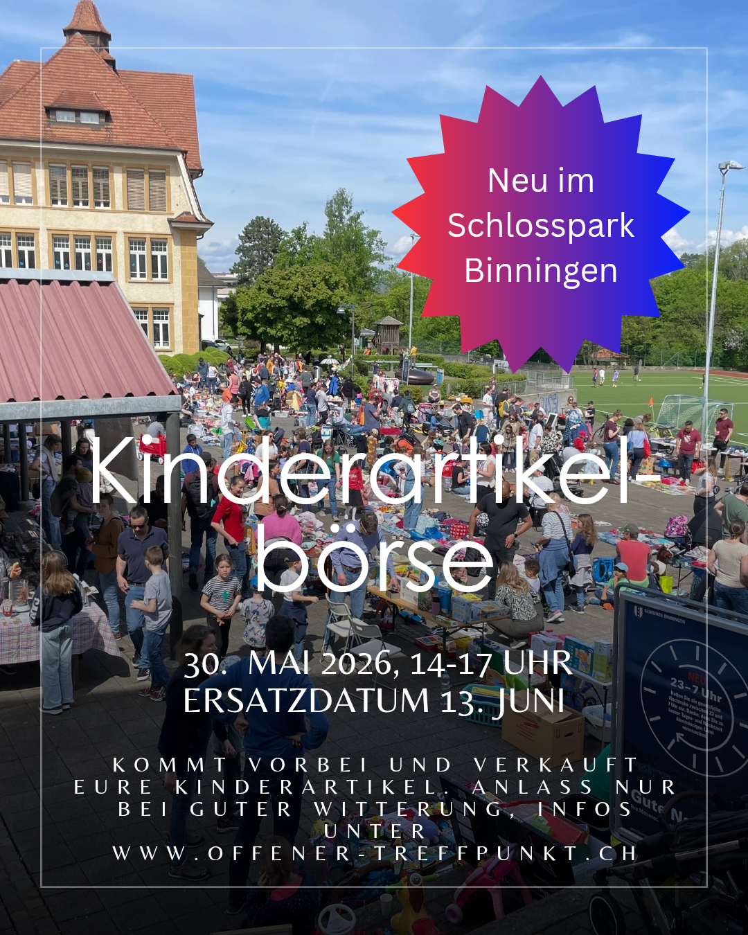 Jetzt geht’s los, sortiert eure überzähligen Kinderartikel: Am Samstag 30. Mai von 14-17 Uhr ist Kinderartikelflohmarkt mit gratis Verkaufsplatz im Binninger Schlosspark! Bücher, Spiele, Kinderkleider – alles ist willkommen! Ihr bringt einfach eure Decke mit und breitet eure Sachen aus. Ihr müsst Euch dafür nicht vorgängig anmelden.